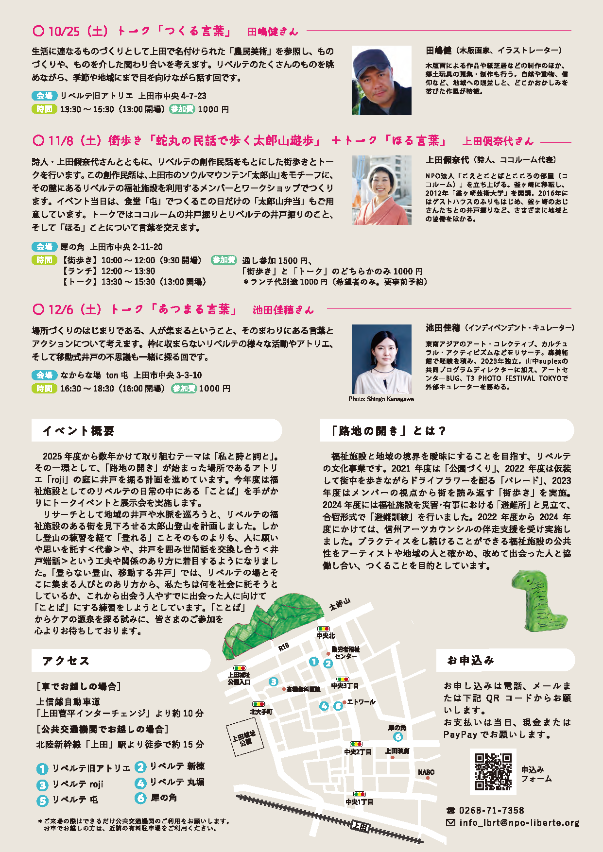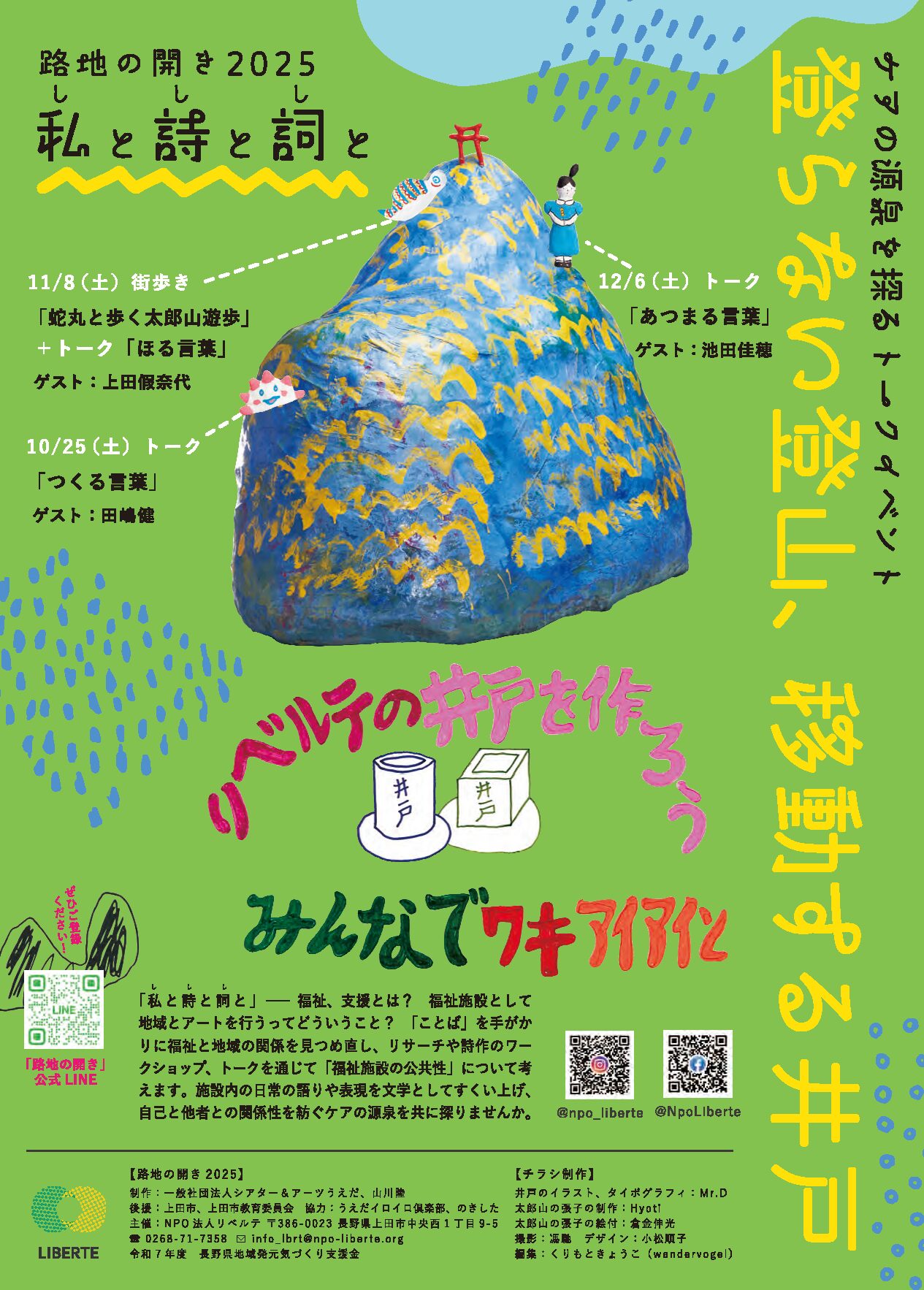 詩人·上田個奈代さんとともに、リベルテの創作民話をもとにした街歩きとトークを行います。この創作民話は、上田市のソウルマウンテン「太郎山」をモチーフに、その麓にあるリベルテの福祉施設を利用するメンバーとワークショップでつくります。イベント当日は、食堂「屯」でつくるこの日だけの「太郎山弁当」もご用意しています。トークではココルームの井戸掘りとリベルテの井戸掘りのこと、そして「ほる」ことについて言葉を交えます。